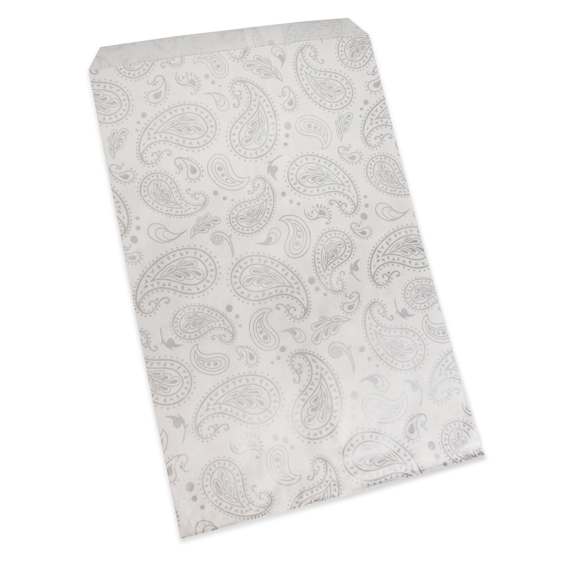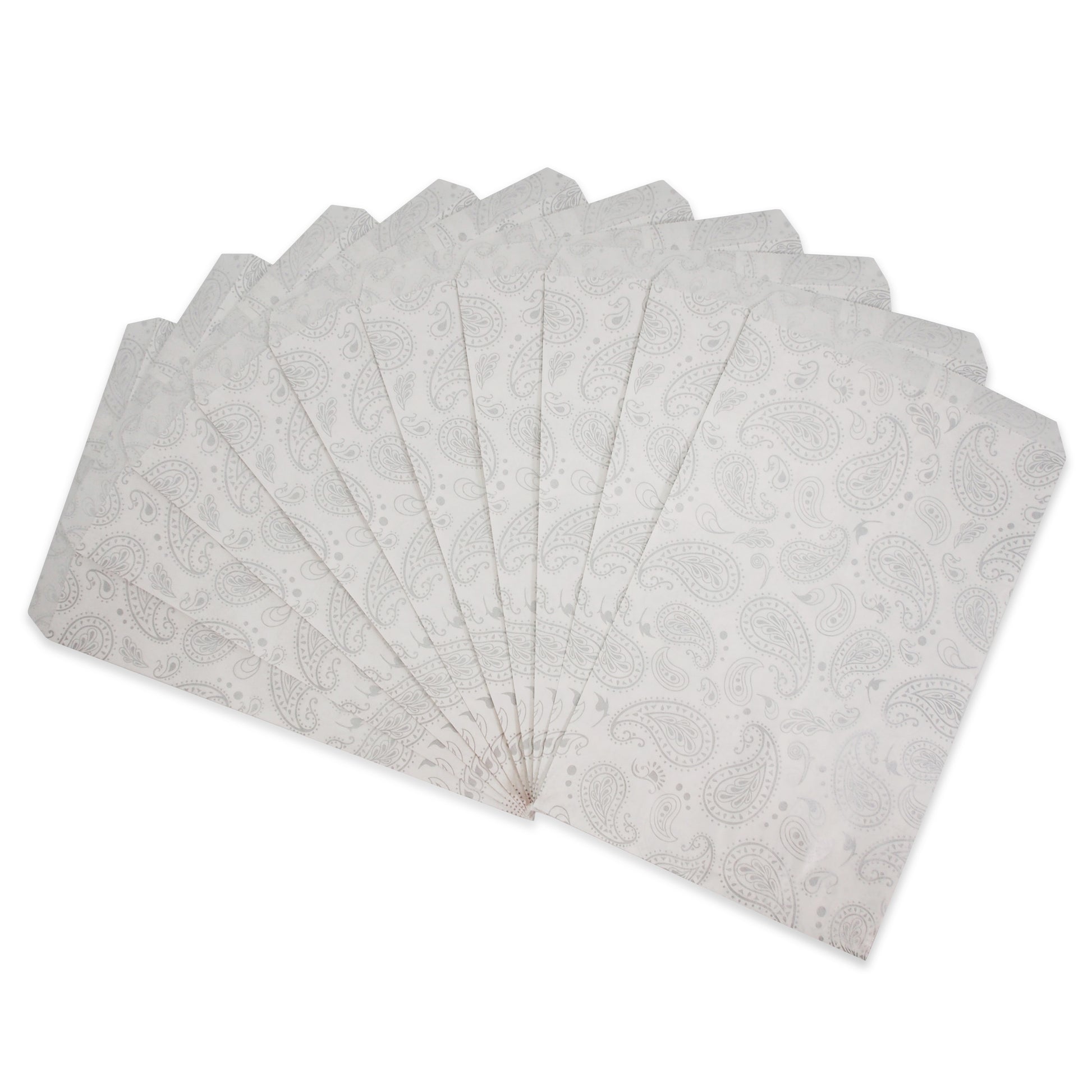 6" x 9" Decorative Flat Paper Gift Bags - Fancy Silver Paisley Pattern on White Kraft Bags - For Sales/Treats/Parties Cookies/Gifts