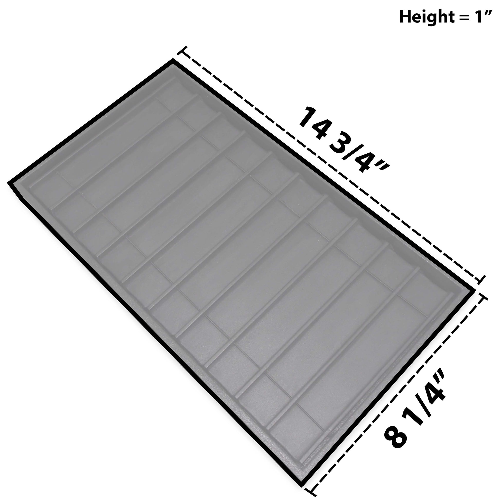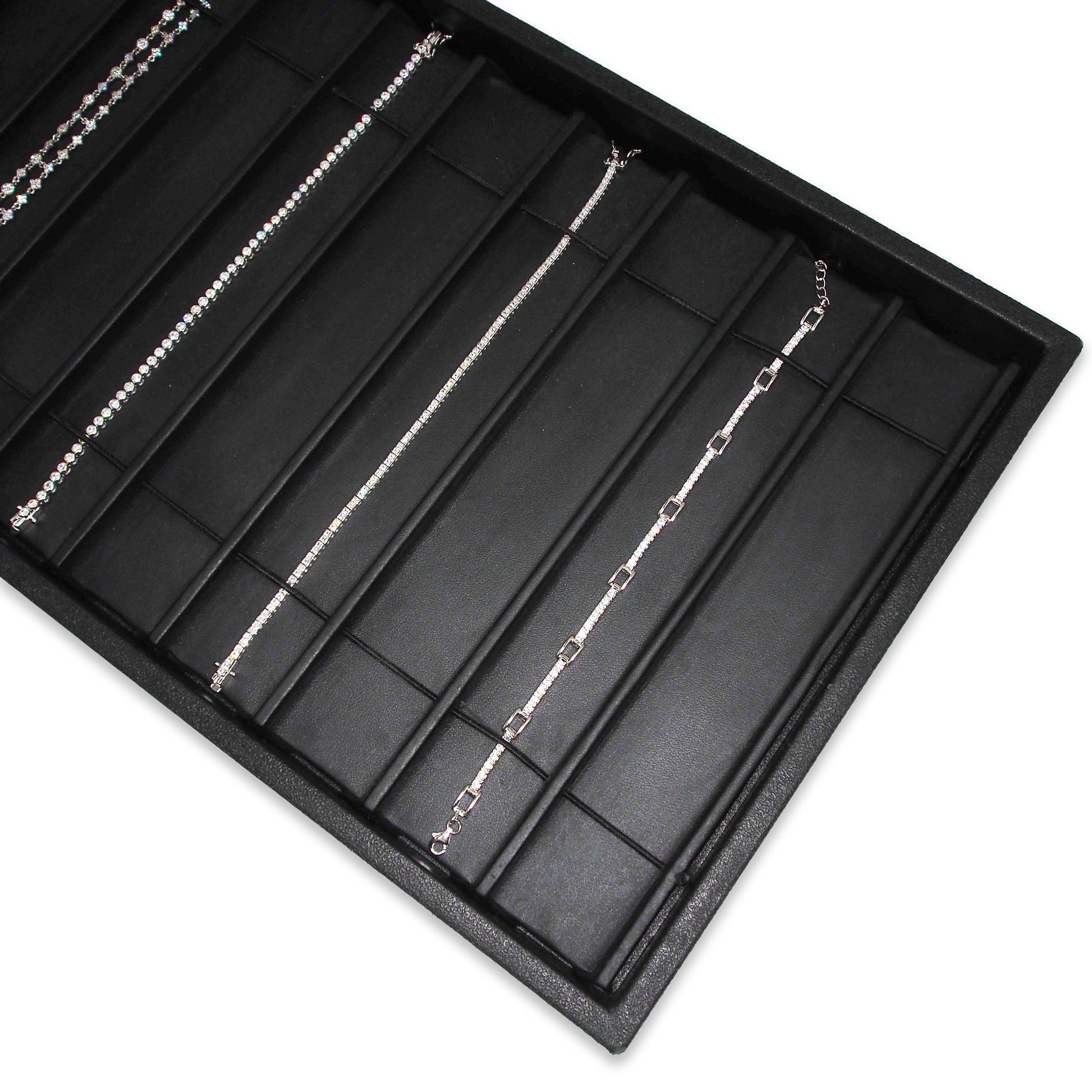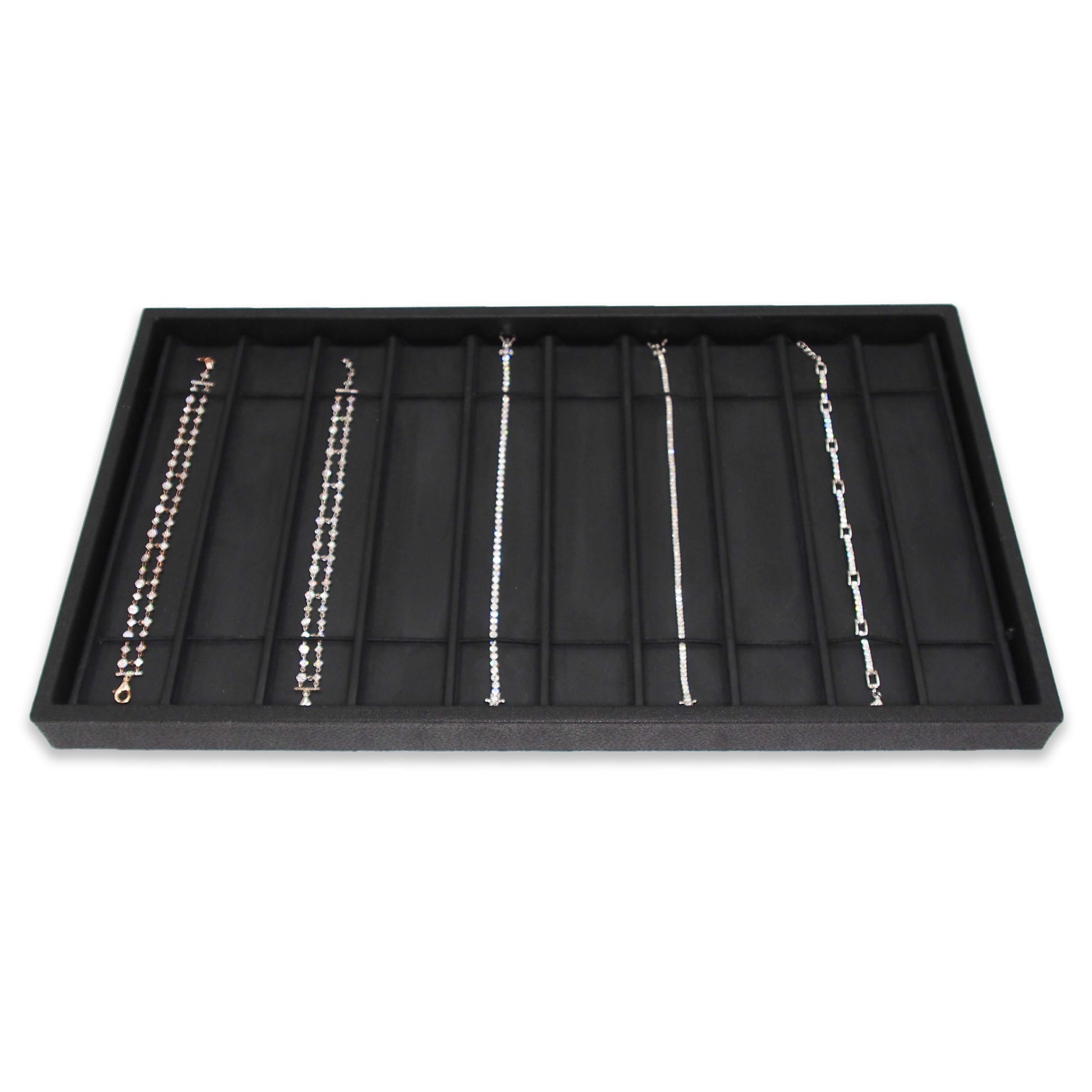 This deluxe bracelet tray liner is an excellent way to keep bracelets organized and on any display. This tray liner holds up to 10 bracelets and will fit in any standard sized tray! Jewelry not included. Measures: 14 1/8" Long by 7 5/8" Wide Approximately 1 1/8" Space