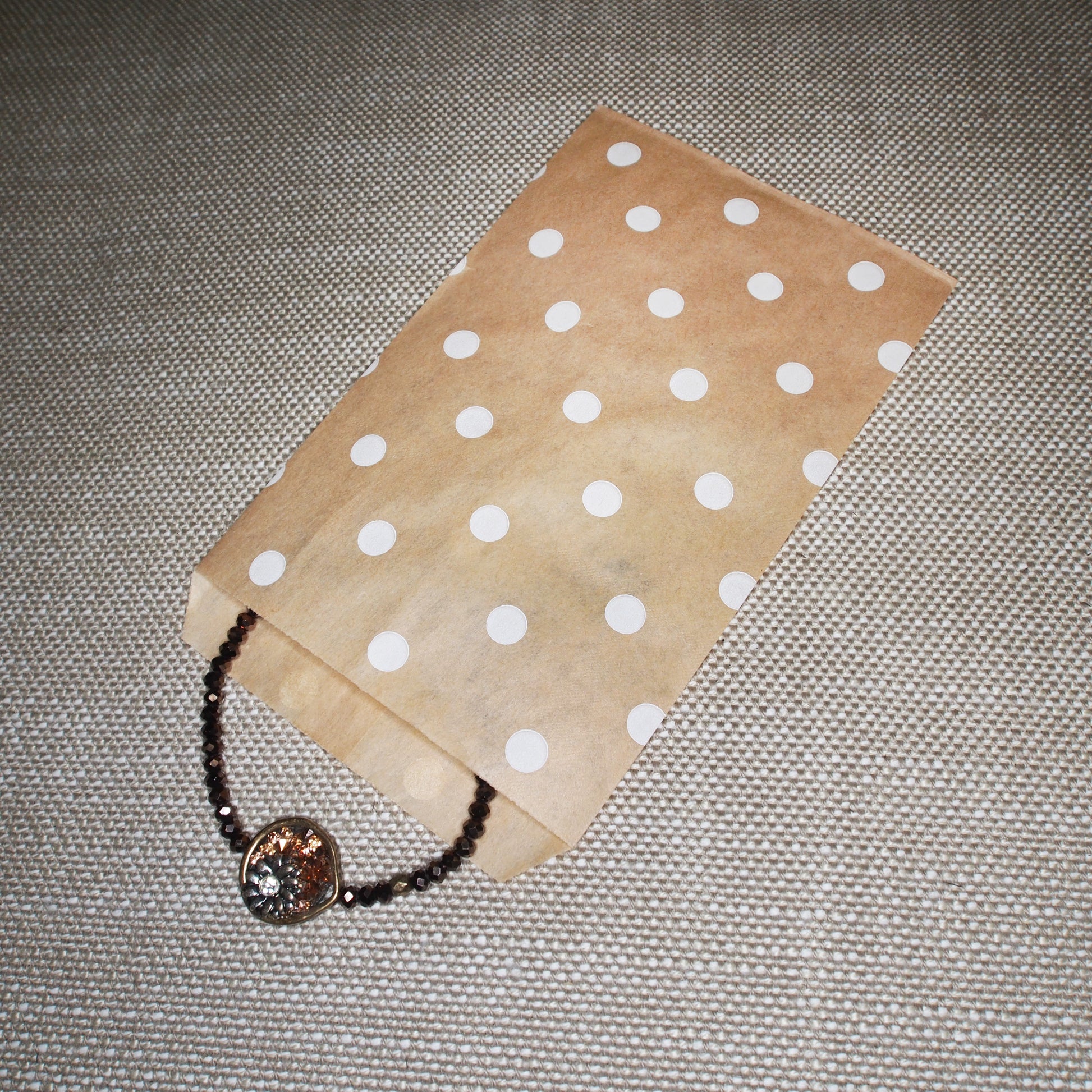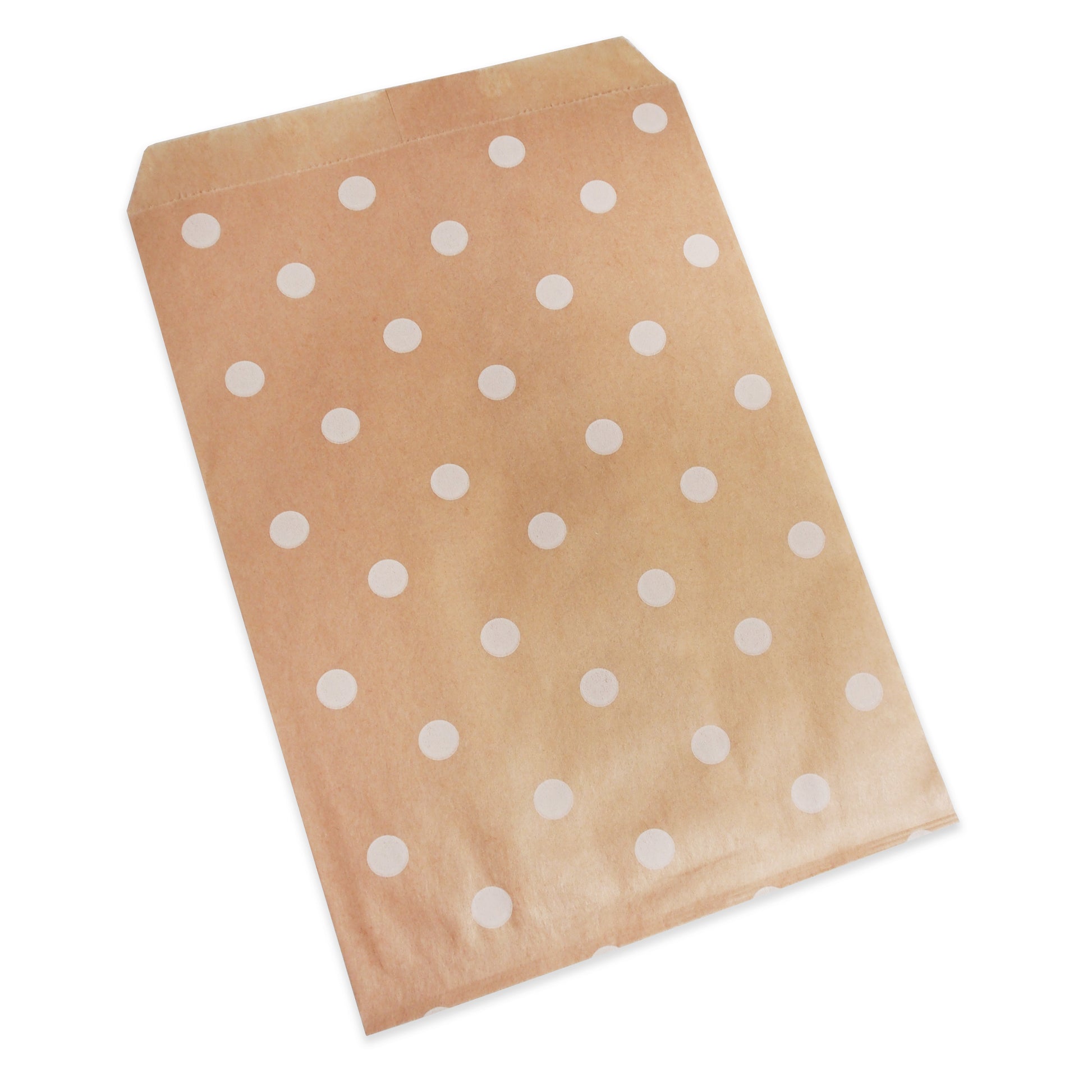 These Brown Bags come with eitherWhite or Red Polka Dots. These Flat Paper Bags come in packages of 100. Available in four different sizes.