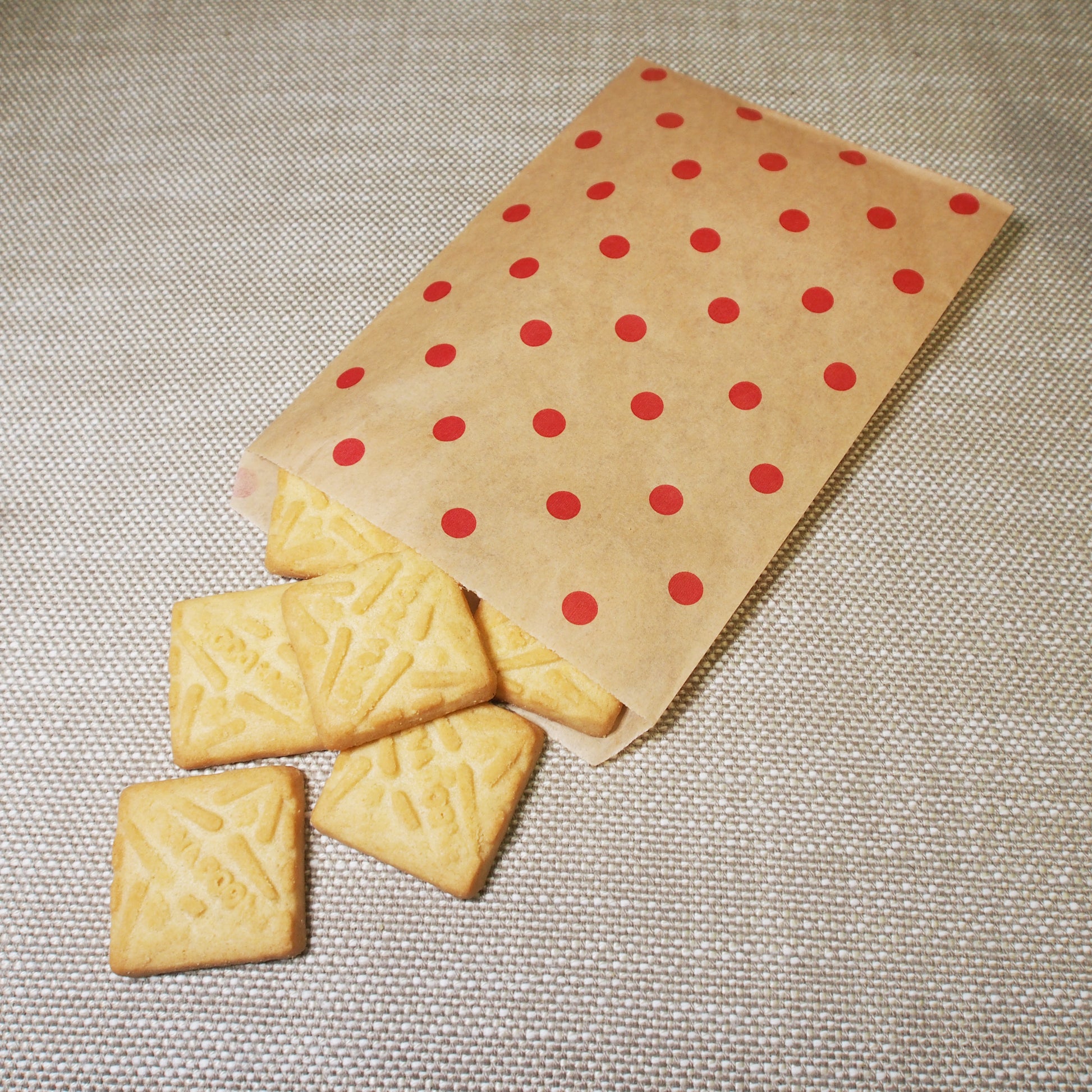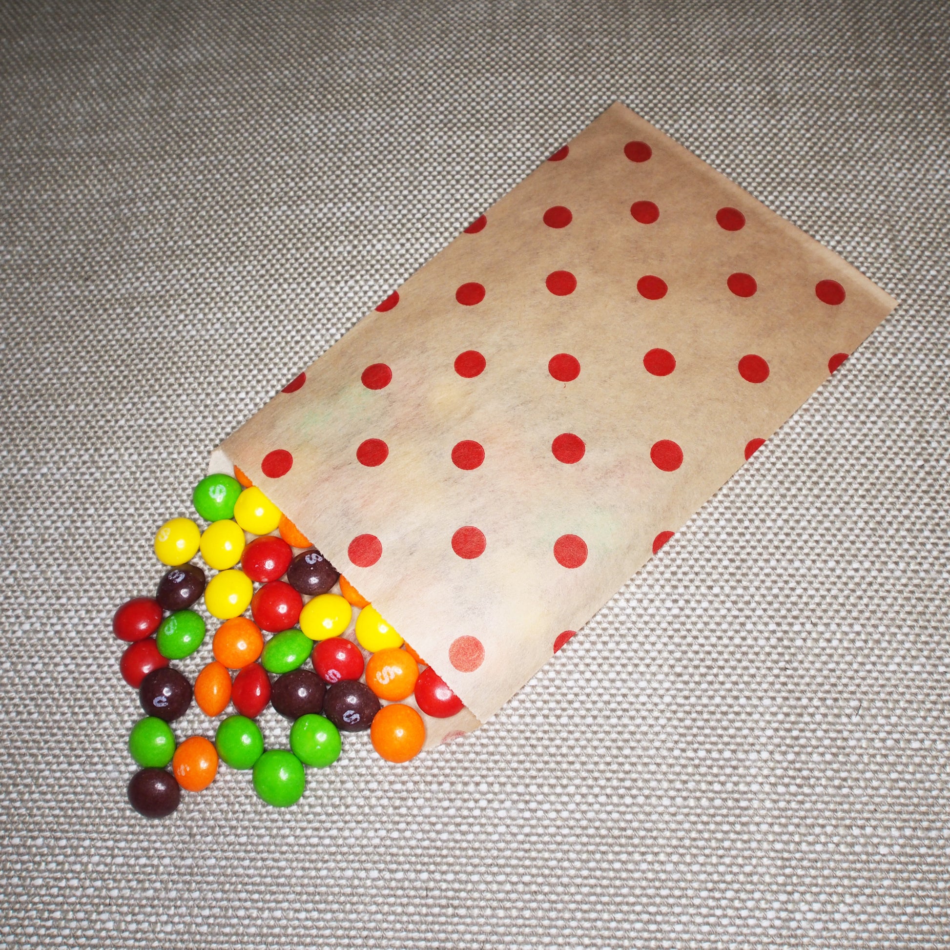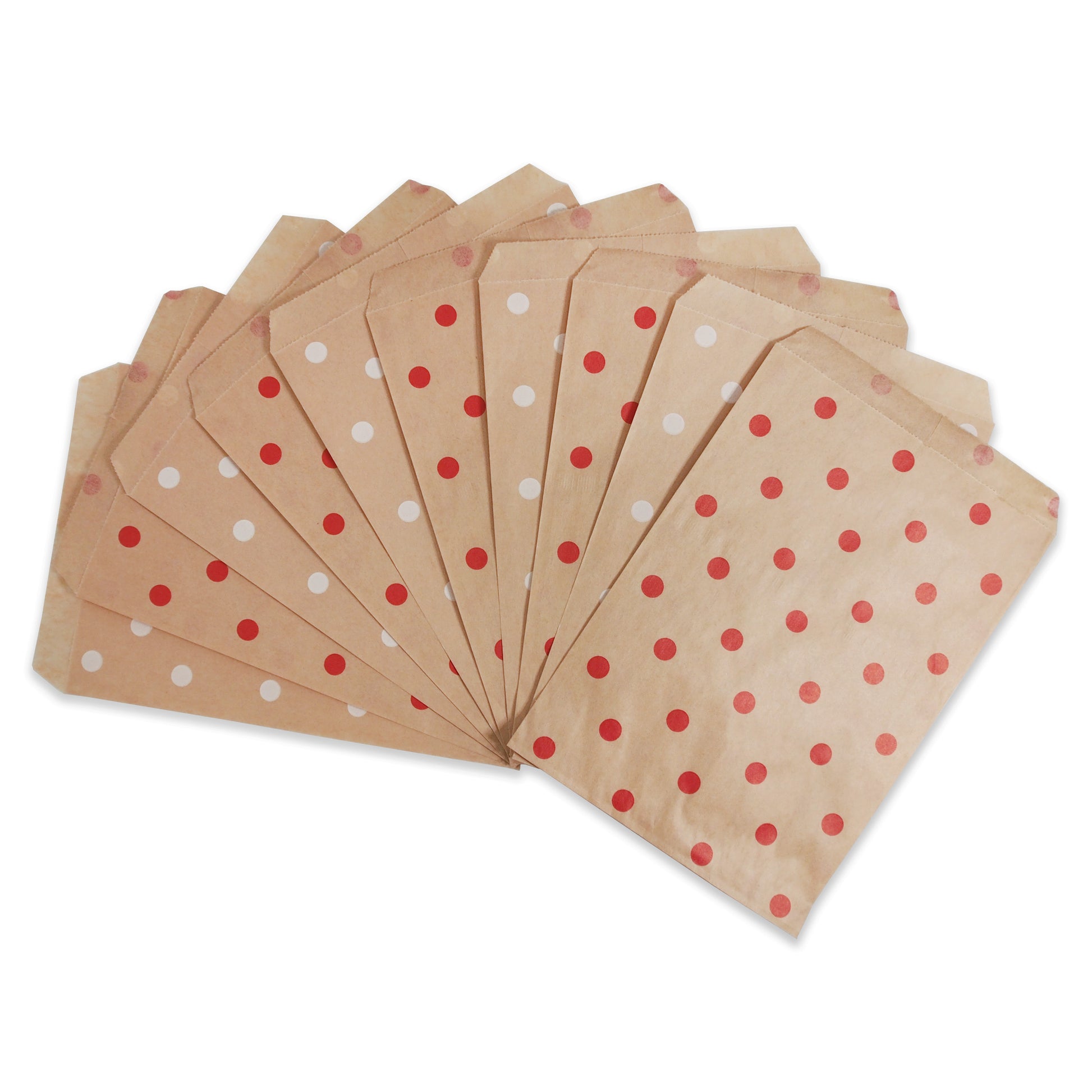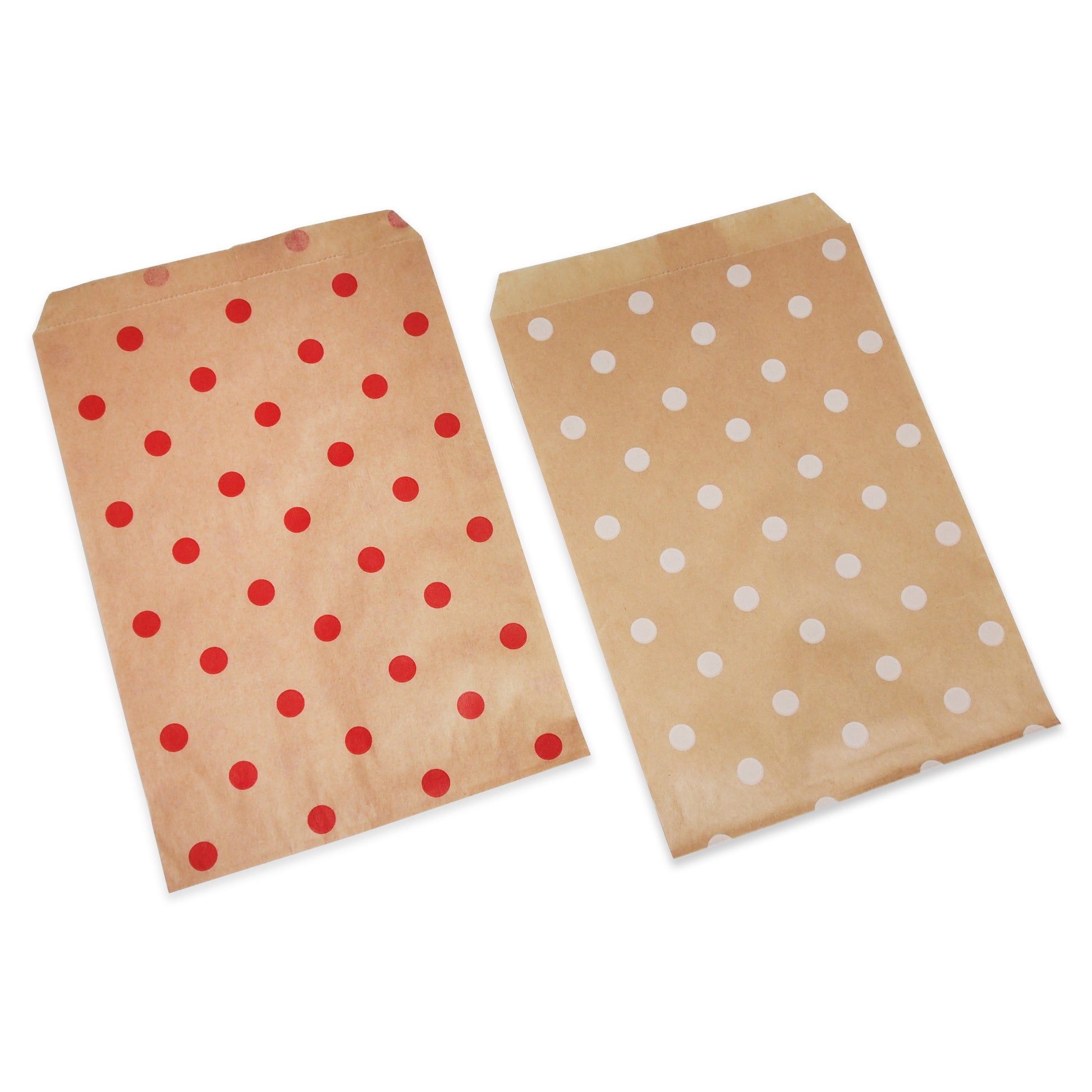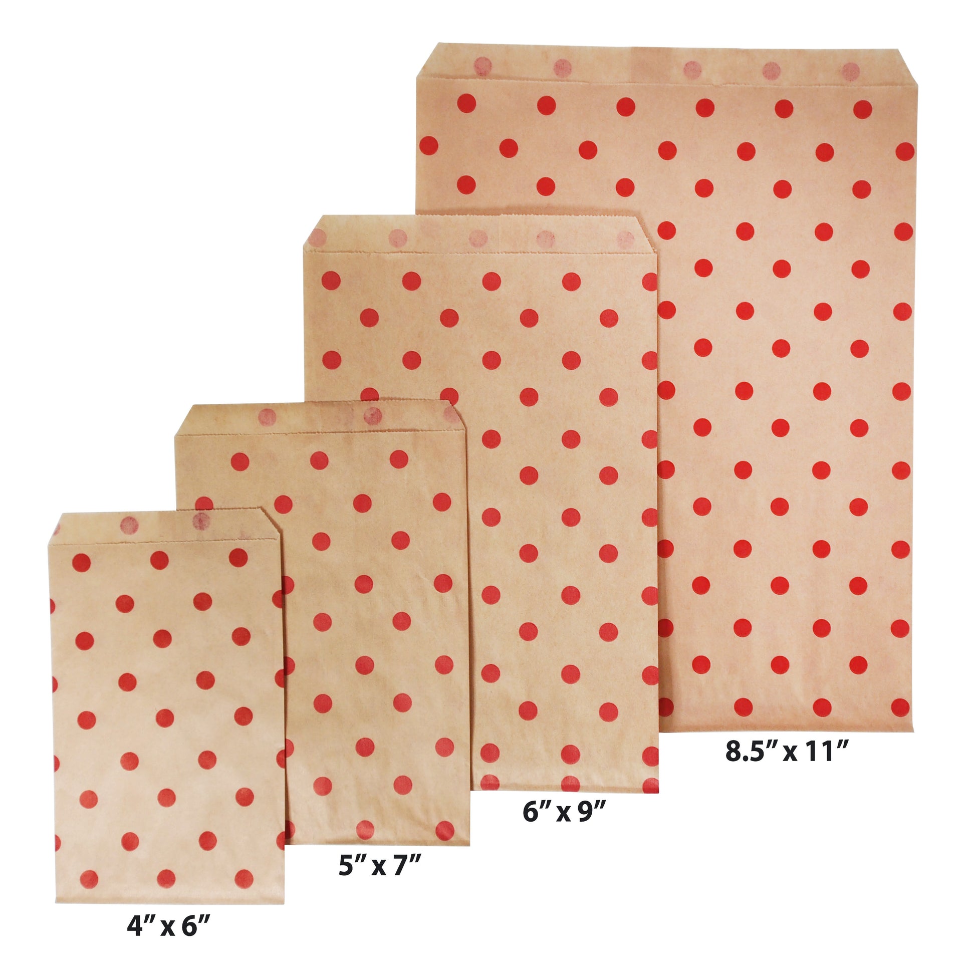 Red or White Polka Dots on Brown Flat Paper Bags -100Bags/Pack- Multiple Sizes